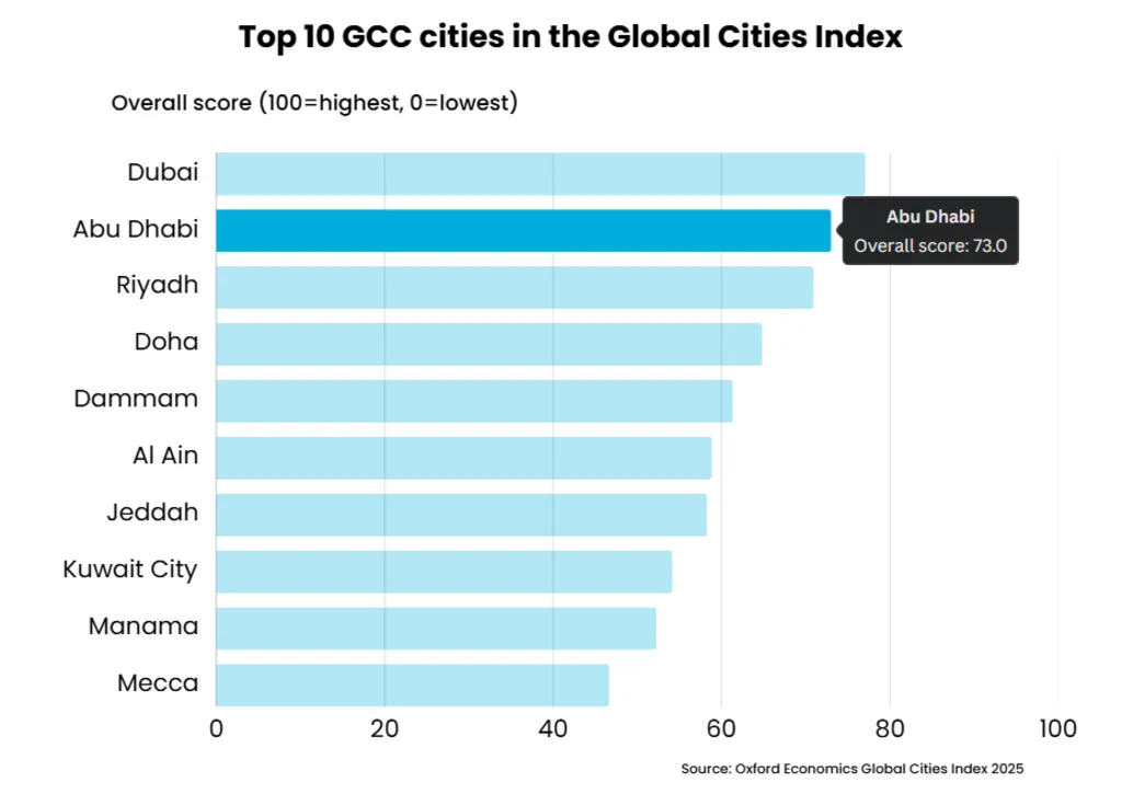 In the 2025 Global Cities Index published by Oxford Economics, Abu Dhabi secured the second-highest ranking among Gulf Cooperation Council (GCC) cities, with a score of 73.0 out of 100. This strong performance in Abu Dhabi City Competitiveness reflects the city’s strategic investments in education, infrastructure, and public services, positioning it as a balanced and forward-looking urban hub. The index, which evaluates 1,000 cities worldwide, highlights Abu Dhabi’s growing influence in both regional and global competitiveness.
