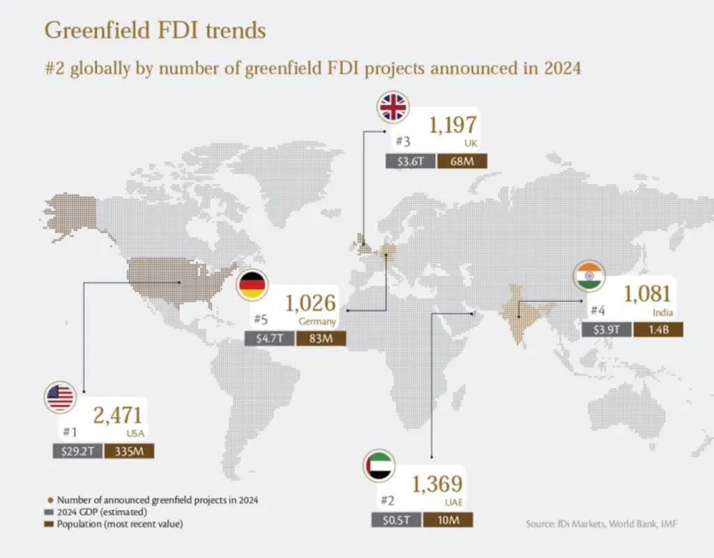 Abu Dhabi FDI Trends in 2025 reflect a strategic shift toward tech, sustainability, and regional headquarters. The emirate’s $596 million in greenfield investments may be smaller in volume, but they are high in strategic value—positioning Abu Dhabi as a rising force in the UAE’s diversified economic future.