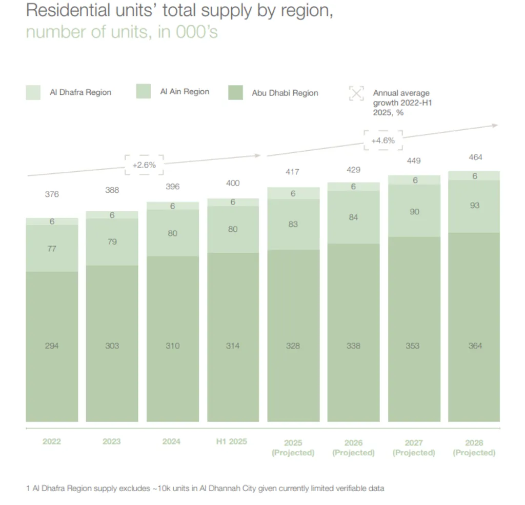 Between 2022 and H1 2025, residential demand across Abu Dhabi grew at an average annual rate of 5.8%, driven by population growth, foreign direct investment, and a shift toward high-quality housing. In contrast, supply expanded at just 2.6% annually, reaching approximately 400,000 units by mid-2025. This imbalance is most pronounced in the Abu Dhabi Region, which holds 78% of the emirate’s residential stock and saw demand grow by 6% versus a 2.7% supply increase.