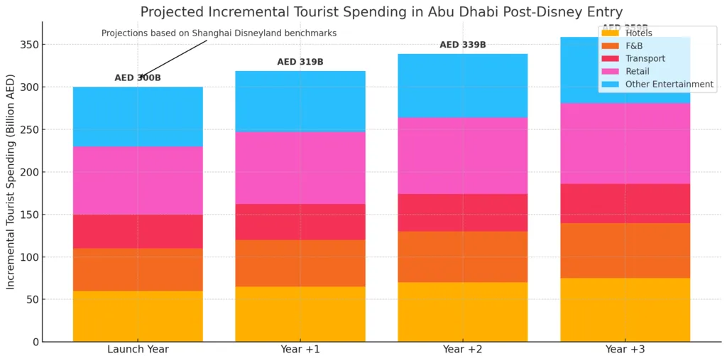 Disney’s presence will likely catalyze a tourism super-cycle. Looking to the Shanghai Disneyland precedent, which drew over 11 million visitors in its first year, we estimate Abu Dhabi’s park could attract a similar 10–12 million annual visitors once mature. That level of traffic is projected to inject AED 300–400 billion in incremental tourism-related spending over the first five years alone—benefiting not just the hospitality sector, but retail, logistics, aviation, and local infrastructure development. This will not displace existing assets. If anything, Disney’s gravity will expand the tourism pie, driving longer stays, repeat visitation, and cross-brand consumption. Yas Island, which welcomed approximately 38 million visits in 2024, will likely transform into a regional leisure cluster rivaling Orlando or Anaheim in strategic importance.