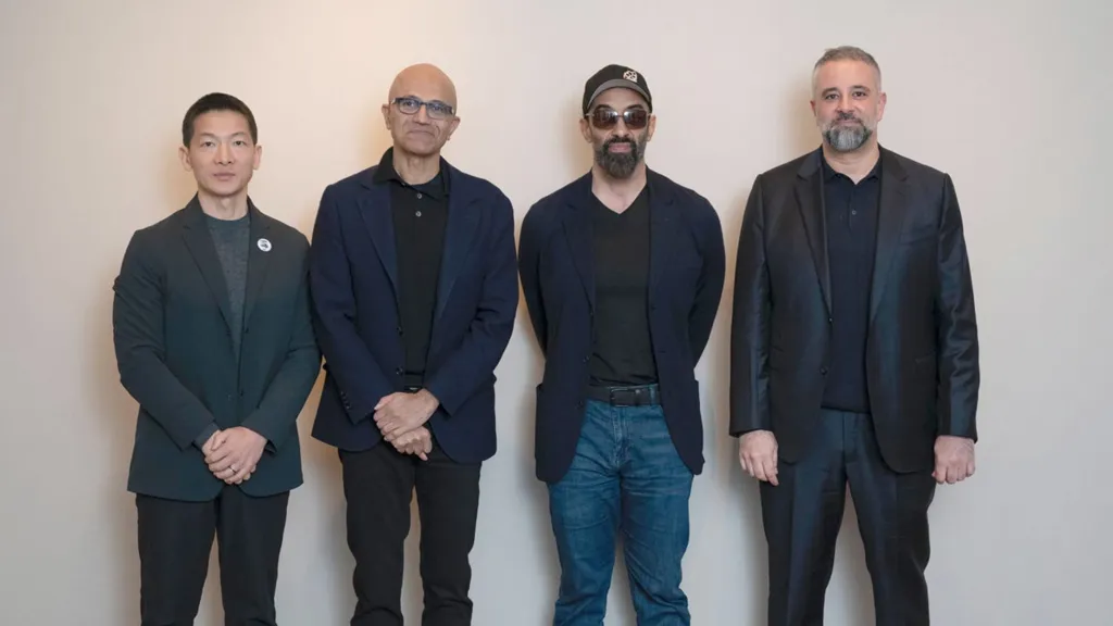 Senior leaders from Microsoft, G42, and the Abu Dhabi Government—including Satya Nadella, Peng Xiao, H.H. Sheikh Tahnoon bin Zayed Al Nahyan, and Ahmed Al Kuttab—were present at the signing.